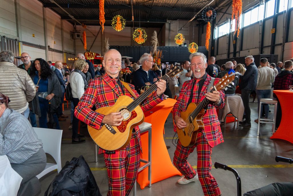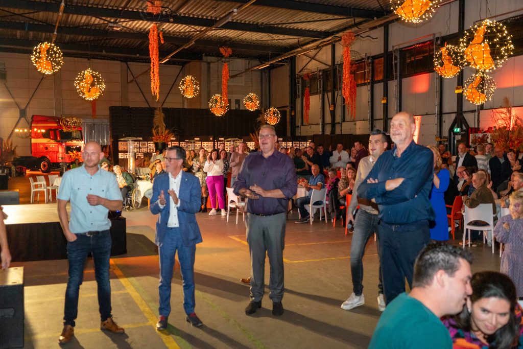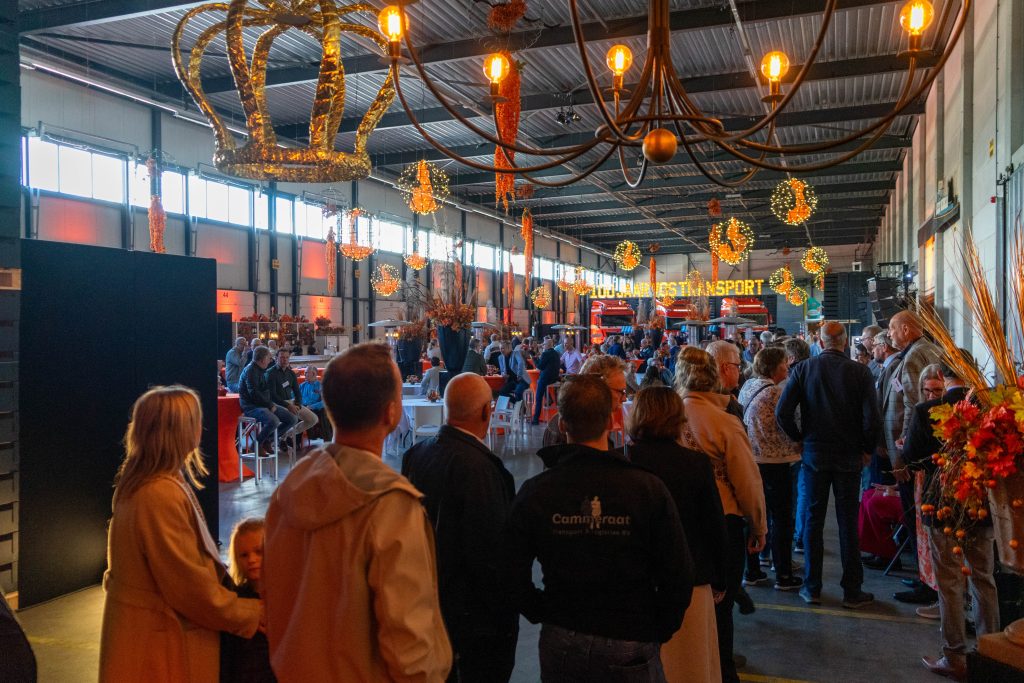Op vakkundige wijze werden de oranje DAF- en MAN trucks tot op de millimeter nauwkeurig in de rij gezet voor het bedrijf zodat een imposante doorgang ontstond waar de gasten doorheen moesten lopen om bij de entree van de receptie te komen. De oranje loper werd uitgerold en binnen werd de ruimte onder leiding van de vakmensen van de BBQ-Kampioen stijlvol en feestelijk in oranje Vos-sferen gebracht. Kroonluchters in de bedrijfshal, dat hadden we nog niet eerder gehad.